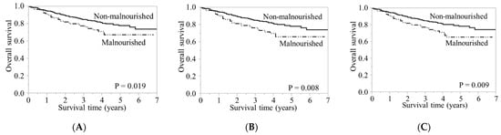 Figure 2 shows the survival curves of the malnourished and non-malnourished group according to the GLIM criteria in all patients. In the malnourished group, the five-year survival rate was 68%, 66%, and 66% when using the SMI, FFMI, and AC, respectively. In the non-malnourished group, the five-year survival rate was 78%, 78%, and 79% when using the SMI, FFMI, and AC, respectively. GLIM malnutrition had a significantly poor prognosis when any of the three indicators of RMM was used.