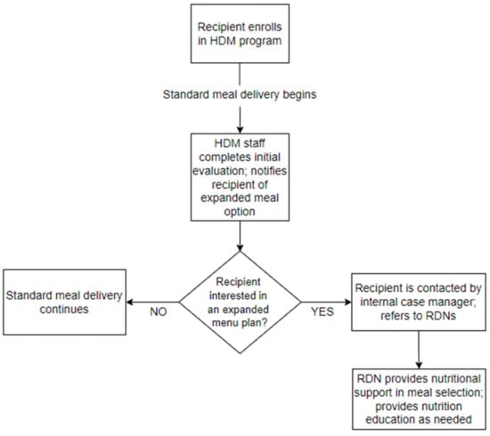 RDN referral program. After enrolling in HDMs at the partner agency, older adults completed an initial evaluation with HDM assessment staff member who obtained information pertaining to each older adult’s socio-demographics, income, nutritional status, functional status, and health history. During this initial evaluation period, HDM staff members were encouraged to inform new HDM enrollees that, if interested, enrollees could be referred to one of the agency’s RDNs who could provide basic nutrition education, evaluate the need for specialized meals, and assist in the selection of specialized meal choices. If interested in RDN services, HDM assessment staff notified the agency’s internal case manager, who coordinated referrals to an RDN (see Figure 2 for RDN referral program process). Upon receiving each referral, RDNs contacted HDM recipients via phone to provide nutrition education service calls at no cost to the recipient. During each call, RDNs provided basic nutrition education, reviewed the nutritional content of meals, identified nutrition education materials that could be sent to the older adult in the mail, and provided guidance to recipients in their selection of meals from the expanded meal plan. Although the nutritional needs of recipients were quite varied, the typical length of RDN phone calls with recipients ranged from 15–20 min in duration. As an illustrative example, one recipient was unable to continue with his chemotherapy treatment schedule due to extreme weight loss. Through the RDN referral program, an agency RDN assisted the recipient in selecting meals that were high in protein and calories to promote healthy weight gain.