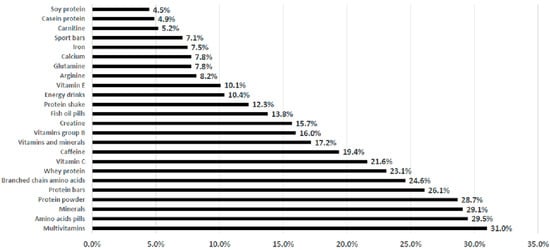 A previous study conducted in Italy by Cannataro et al., (2019) [17], with more than 3000 participants, showed that the supplements mostly used by sportsmen and women were whey protein, branch chain amino acids (BCAA), creatine, multivitamins, and “pre-workout” supplements. The main purpose for dietary supplementation was muscle building in males, weight loss in females, and health benefits for both sexes. The main sources of information on dietary supplements were social media, friends and training mates, trainers, and coaches, while only 4% of participants consulted qualified professional figures [17]. The types and amounts of supplements used by sportsmen change according to which sports they engage in, and the specialties associated with each. Bodybuilders, who pursue muscle hypertrophy, are keener to use dietary supplements and hormones than other gym users [18]. In sports that need sprint performance and high-intensity exercises, caffeine, beta-alanine, and other ergogenic supplements are used with the purpose of reducing fatigue and the time for muscular recovery, whereas creatine is normally used to improve performance during short and prolonged intermittent exercise. Recently, nitrate consumption has also been considered to have beneficial effects in high-intensity training [19].