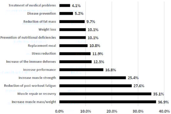 The specific use of dietary sports supplements for increasing muscular mass is confirmed by other studies carried out in Italy. According to Cannataro et al. (2019) [17], the main purpose of dietary supplementation was to build muscle in males, lose weight in females, and achieve health benefits for both sexes. In another Italian study, it was shown that dietary supplements are widely used by those involved in body shaping-oriented fitness training and that the gym users decided individually which supplement to use [10].