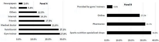 Figure 3 shows the supply modalities of the sub-sample that reported the use of sports supplements. Gym trainers (27.9%), nutritionists (27.1%), and medical doctors (21.9%) were the most reported professionals that prescribed food supplements in the present sample (Figure 3—Panel A). Almost one-third of respondents reported buying supplements from specialized sports nutrition stores (36.6%), in pharmacies (31.7%), and online (27.1%). The remaining percentage (4.6%) of the sample obtained supplements directly from trainers (Figure 3—Panel B).