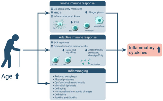 Concept of inflammaging. Due to immunosenescence associated with changes in the innate and adaptive immune response, inflammatory pathways are increasingly activated, leading to a constant low-grade inflammatory state also termed inflammaging (modified after [10]). Abbreviations used: Up-arrow–increased; down-arrow—reduced; MHCII—major histocompatibility complex II; IFN-I—type-I interferon; DC—dendritic cell; NK—natural killer cell; BCR—B-cell receptor; Th1—type 1 T helper cell; PAMPs—pathogen-associated molecular patterns; DAMPs—damage-associated molecular patterns.