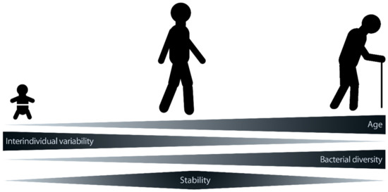 When evaluating the microbiome, two factors are commonly considered that have a substantial impact on health and disease: stability and diversity, with a more stable and diverse microbiome generally being associated with better health (for an overview, see [120]). Starting with birth [121], the individual microbiome is subject to change throughout life [111,122]. The greatest alterations occur during our infancy when the personal microbiome is in its developing stage. This stage is followed by the adult microbiome, which has the highest stability. With further aging, the microbiome becomes again less stable (Figure 3) [123] (and for an overview, see [111,124,125]).