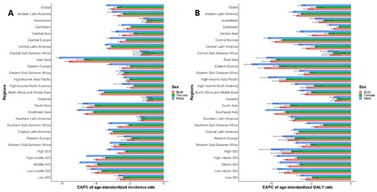 The EAPC of VAD age-standardized rates from 1990 to 2019 by sexes and regions. (A) The EAPC of age-standardized incidence rate. (B) The EAPC of age-standardized DALY rate. Abbreviations: DALY, disability adjusted life-year; EAPC, estimated annual percentage change; SDI, socio-demographic index; VAD, vitamin A deficiency.