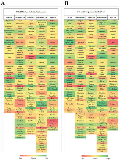 The EAPC of VAD age-standardized rates from 1990 to 2019 by countries. (A) The EAPC of age-standardized incidence rate. (B) The EAPC of age-standardized DALY rate. Abbreviations: DALY, disability adjusted life-year; EAPC, estimated annual percentage change; SDI, socio-demographic index; VAD, vitamin A deficiency.