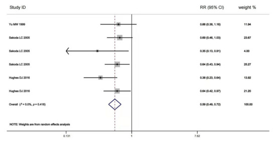 The multivariable-adjusted RRs for each study and comparison of the combined RR between the highest and lowest selenium levels are shown in Figure 2. A random-effects model was used to calculate the overall effect size. The incidence of advanced chronic liver diseases was significantly reduced in the individuals with high body selenium status compared to those with low baseline selenium status (RR = 0.59, 95% CI: 0.49 to 0.72, p = 0.415). No significant heterogeneity (I2 = 0.1%) was found. Begg’s test detected no publication bias (p = 0.452). Furthermore, we conducted a meta-regression analysis and revealed a statistically significant linear dose-response relationship between blood selenium level and chronic liver diseases incidence. However, no statistically significant dose-response relationship was found between blood selenium increment and the risk for chronic liver diseases incidence (RR = 1.01, 95% CI: 0.78 to 1.30, p = 0.663).