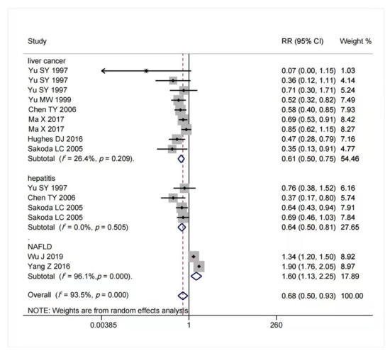 Pooled RRs of selenium intake and chronic liver diseases. Stratified by disease progression [17,40,73,75,78,79,80,81,82,83].