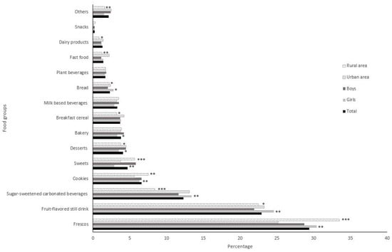 Added sugars were primarily provided by frescos (29.4%), fruit-flavored still drinks (22.9%), and sugar-sweetened carbonated beverages (12.3%), for a total added sugar contribution of 64.6% (Figure 2). These three foods provided more added sugars in girls (p < 0.01). Frescos contributed more added sugars in rural vs. urban adolescents (33.5% and 25.2%, respectively, p < 0.0001). Fruit-flavored still drinks and sugar-sweetened carbonated beverages contributed more added sugars in urban adolescents (p < 0.01) (Figure 2).