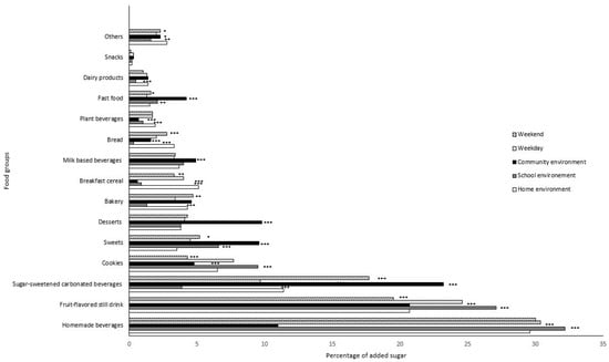 Sugar-sweetened carbonated beverages, sweets, desserts, bakery products, milk-based beverages, fast food, and dairy products consumed by adolescents in the neighborhood environment jointly contributed more added sugars than other socialization spaces. The contribution of added sugars from sugar-sweetened carbonated beverages, sweets, bakery products, and fast foods was higher on weekends (p < 0.01). In contrast, added sugars provided by breakfast cereals, cookies, and fruit-flavored still drinks were higher on weekdays (p < 0.01).