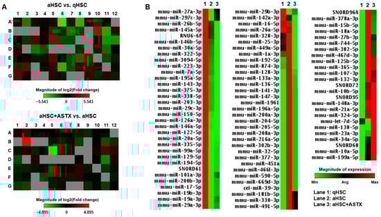 miRNA PCR array heatmaps. Primary mouse qHSC, aHSC, and aHSC treated with 25 µM of ASTX (aHSC + ASTX) were subjected to miRNA PCR array for mouse fibrosis. (A) Heatmaps of the miRNA array comparing miRNA profiles of aHSC vs. qHSC, and aHSC treated with ASTX (aHSC + ASTX) vs. aHSC. (B) Heatmap of miRNA expression in primary mouse HSC. Lanes 1, 2, and 3 show qHSC, aHSC, and aHSC + ASTX, respectively. The magnitude of expression is shown in the scale bar.