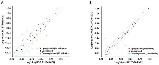 Scatter plots of miRNA expressions by miRNA PCR array. The expression of 84 miRNAs and 6 small nucleolar RNAs as log10 (2^-DeltaCt) in primary mouse aHSC and in qHSC (A) and in aHSC + ASTX and aHSC (B). The midline indicates no difference in the expression between two groups, while lines above or under the midline indicate the boundary of 2-fold regulation in the expression. Red and green dots represent each miRNA or small nucleolar RNA, upregulated and downregulated, respectively.