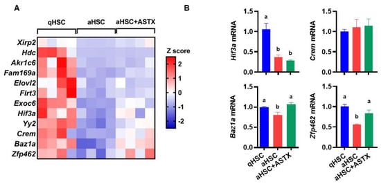 The potential target genes of miR-382-5p in primary mouse HSC. (A) The expression of 12 target genes of miR-382-5p was analyzed by RNA sequencing in qHSC, aHSC, and aHSC treated with ASTX (aHSC + ASTX). Z-scores for the expression are shown in the scale bar. n = 4. (B) The expression of Hif3a, Crem, Baz1a, and Zfp462 measured by qRT-PCR. n = 6. Bars with a different letter are significantly different (p < 0.05). Mean ± SEM.