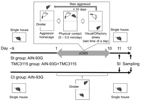 Experimental design. Mice in both the St and TMC3115 groups were subjected to the subchronic and mild social defeat stress (sCSDS) for 10 days. The behavior of all mice was observed by the social interaction (SI) test on Day 11.