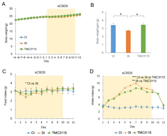 The average body weight of each group during the experiment is shown in Figure 2A, and no significant difference between the groups was observed. On the other hand, the body weight gain (vs. the body weight at Day 9) after the sCSDS period significantly decreased in the St group compared with the Ct and TMC3115 groups (p = 0.045 and p = 0.021, respectively; Figure 2B). A significant lower food intake was observed in the St group compared with the Ct group during the sCSDS period (p = 0.027, Figure 2C). However, there was no significant difference in the total food intake through the experiment between the groups (Ct: 69.9 ± 1.5 g, St: 69.0 ± 1.0 g, TMC3115: 70.4 ± 1.3 g). Although the water intake of the TMC3115 group was lower than that of the St group during the sCSDS period (p = 0.003), both groups showed a greater water intake compared with the Ct group mice (p < 0.001; Figure 2D).
