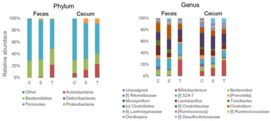 Bacterial composition in feces and cecal contents. C: control mice, S: unsupplemented sCSDS mice, T: sCSDS mice supplemented with TMC3115. The number of mice analyzing fecal bacteria on Day −9, Day 0, and Day 11 were C (n = 19, 18, and 18), S (n = 23, 23, and 19), and T (n = 19, 20, and 19), respectively. For cecal bacterial analysis, the number of mice were C (n = 20), S (n = 24), and T (n = 25), respectively.