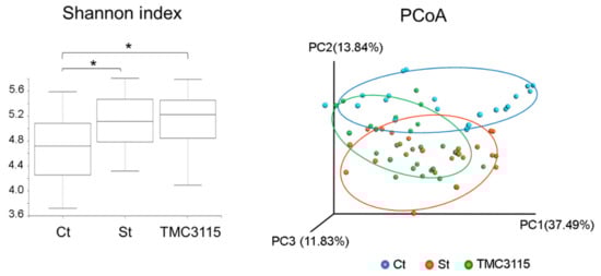The α- and β-diversities of cecal microbiota. Ct: control mice, St: unsupplemented sCSDS mice, TMC3115: sCSDS mice supplemented with TMC3115. * indicates significant differences between groups, * p < 0.05.