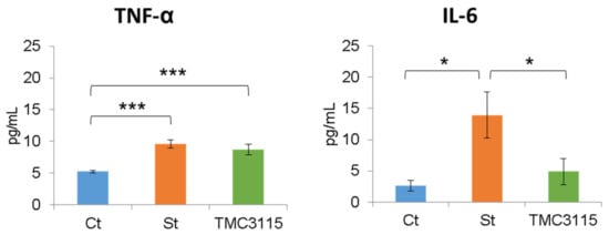 Serum levels of TNF-α and IL-6. Ct: control mice; St: unsupplemented sCSDS mice; TMC3115: sCSDS mice supplemented with TMC3115. Bars represent mean ± SE. * indicates significant differences between groups, * p < 0.05, *** p < 0.001.