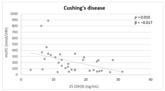 Multivariate analysis showed that mUFC was independently inversely associated with 25(OH)D (p = 0.010) in patients with CD (Figure 1). In the controls, no significant associations were found.