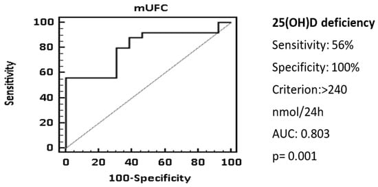 The ROC analysis showed that a cut-off of mUFC > 240 nmol/24 h was associated with 25(OH)D deficiency with a specificity of 100% and a sensitivity of 56.9%, AUC 0.803 (Figure 2).