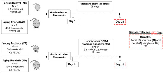 After two weeks of acclimatization, mice were randomly allocated into the following groups based on their age and treatments (n = 8 per group): (1) young control (YC), (2) young probiotic (YP), (3) aging control (AC), and (4) aging probiotic (AP). Figure 1 describes the study design and sample collection, also reported previously [25,26]. Briefly, mice in YC and AC groups received 4 g of standard mice chow mash (i.e., chow pellet blended in distilled water). The YP and AP groups received 4 g of chow mash supplemented with L. acidophilus DDS-1 (3 × 10 9 CFU/g/mouse), freshly prepared daily for 28 days. All mice were single-caged and daily food intake was recorded. There were no differences in the daily intake of the treatment-supplemented chow among groups. All animals were euthanized on day 28.