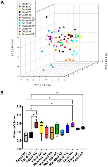 Fecal, mucosal, and cecal microbial diversity profiles in young and aging mice. (A) Principal coordinate analysis (PCoA) (unweighted UniFrac) showed divergence in fecal, mucosal, and cecal samples across ages (R2 = 0.265; p < 0.001). (B) Boxplots of pairwise comparison showing no probiotic treatment-related differences in alpha diversity profiles between the samples by Shannon’s index. * Significant differences with p < 0.05. The values are shown as means ± SEM. (YC) Young control group, (YP) young probiotic group, (AC) aging control group, and (AP) aging probiotic group.