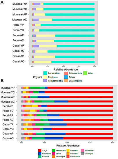 Fecal, mucosal, and cecal microbiota composition profiles in young and aging mice at the phylum (A) and genus levels (B) in control and probiotic-treated groups, revealed by 16S rRNA gene sequencing (each color represents bacterial phylum and/or genus). (YC) Young control group, (YP) young probiotic group, (AC) aging control group, and (AP) aging probiotic group.