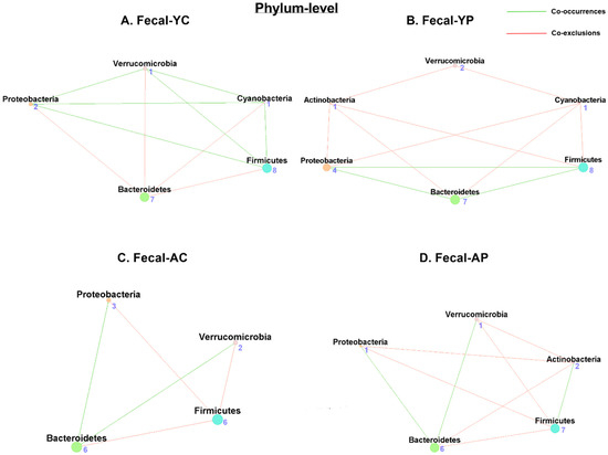 Our network analysis on fecal samples revealed 5 nodes and 10 associations (6 co-occurrences and 4 co-exclusions) in F-YC (Figure 5A), while F-YP had 6 nodes and 11 associations (3 co-occurrences and 8 co-exclusions) (Figure 5B). Firmicutes, Verrucomicrobia, Proteobacteria, and Cyanobacteria shared the phyla with the most co-occurrences in F-YC, while Bacteroidetes had the most co-exclusions (Table S2). The phyla with the most co-occurrences in F-YP were Actinobacteria and Cyanobacteria, and Bacteroidetes has the most co-exclusion. In comparison, there were 4 nodes and 5 associations (2 co-occurrences and 3 co-exclusions) in F-AC (Figure 5C), and 5 nodes and 9 associations (3 co-occurrences and 6 co-exclusions) in F-AP (Figure 5D), while F-AC was less connected and phylum Bacteroidetes had the most co-occurrences, and Firmicutes had the most co-exclusions. Remarkably, F-AP was more connected than F-AC and phylum Bacteroidetes had the most co-occurrences, and Proteobacteria and Firmicutes had the most co-exclusions (Figure S2).