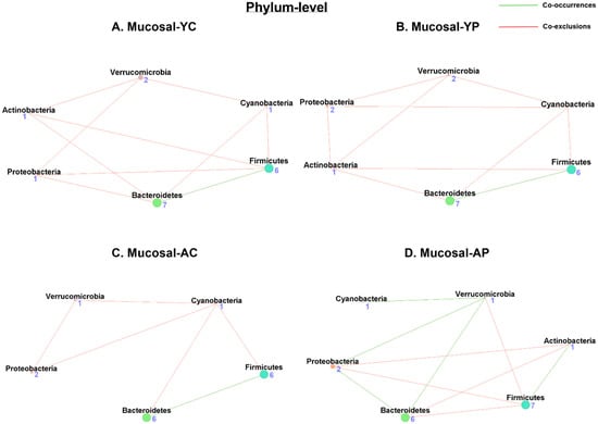 Our network analysis of the mucosal samples showed 6 nodes and 10 associations (1 co-occurrence and 9 co-exclusions) in M-YC (Figure 7A), while M-YP (Figure 7B) had 6 nodes and 10 associations (1 co-occurrence and 9 co-exclusions). The phyla with the most co-occurrences in M-YC was Bacteroidetes, while Firmicutes, Verrucomicrobia, Proteobacteria, and Cyanobacteria shared the most co-exclusions, a pattern similar to M-YP. We observed only 5 nodes and 6 associations (1 co-occurrence and 5 co-exclusions) in M-AC (Figure 7C), while M-AP (Figure 7D) had 6 nodes and 10 associations (5 co-occurrences and 5 co-exclusions). However, in M-AC, the Bacteroidetes phylum had a higher level of association as well as the most co-occurrences, and Cyanobacteria had the most co-exclusions. However, the M-AP structure improved, with the Verrucomicrobia phylum having the most co-occurrences, and the phylum Firmicutes had the most co-exclusions (Table S3).