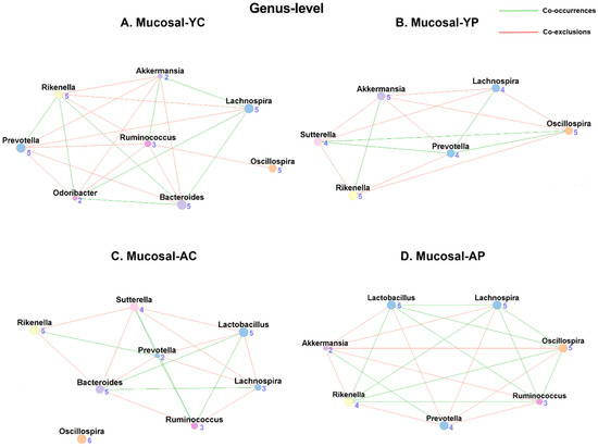 Mucosal genus-level co-occurrence has shown 8 nodes and 17 associations (7 co-occurrences and 10 co-exclusions) in M-YC (Figure 8A), and 6 nodes and 13 associations (5 co-occurrences and 9 co-exclusions) in M-YP (Figure 8B). In the M-AC (Figure 8C), we observed 8 nodes and 17 associations (6 co-occurrences and 11 co-exclusions), while the M-AP (Figure 8D) had 7 nodes and 18 associations (9 co-occurrences and 9 co-exclusions). Unlike fecal samples, we also found Lactobacillus taxon in M-AC (2 co-occurrences and 3 co-exclusions) but not in M-YC. Post-DDS-1 supplementation, the Lactobacillus taxon was only found in M-AP (4 co-occurrences and 2 co-exclusions) (Table 1 and Table S3).