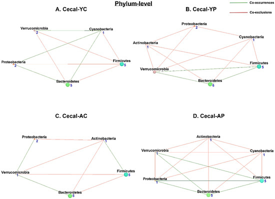 Cecal microbial network analysis has shown 5 nodes and 9 associations (4 co-occurrences and 5 co-exclusions) in the C-YC group (Figure 9A), and the C-YP group (Figure 9B) had 6 nodes and 12 associations (3 co-occurrences and 9 co-exclusions). The phylum with the most co-occurrences was Cyanobacteria, and the Firmicutes phylum had the most co-exclusions in the C-YC group, while Actinobacteria and Cyanobacteria had the most co-occurrences in C-YP. We observed 5 nodes and 8 associations (3 co-occurrences and 5 co-exclusions) in the C-AC group (Figure 9C); in comparison, C-AP (Figure 9D) had 6 nodes and 15 associations (5 co-occurrences and 10 co-exclusions). In C-AC, the Verrucomicrobia phylum had the most co-occurrences, and the Actinobacteria phylum had the most co-exclusions. Firmicutes and Bacteroidetes had the most co-occurrences in the C-AP group. Surprisingly, the Actinobacteria phylum, together with the Cyanobacteria phylum, had the most co-exclusions in both the C-YP and C-AP groups (Table S4).