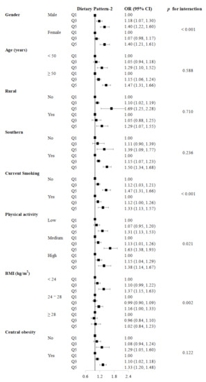 To access the homogeneity of the risk estimates, we conducted stratified analyses for gender (male or female), age (<50 years or ≥50 years), urban or rural, southern or northern, current smoking status (yes or no), physical activity status (low, medium, or high tertile of MET-h/day), BMI (<24.0, 24.0–28.0, or ≥28.0 kg/m2), and central obesity (yes (waist–hip ratio (WHR) ≥ 0.90 for males or WHR ≥ 0.85 for females) or no (WHR < 0.90 for males or WHR < 0.85 for females)) based on Model 2. Furthermore, we accessed the interactions between dietary patterns and the stratified variables mentioned above by adding cross-product terms into Model 2. In the sensitivity analyses, we excluded participants with incident diabetes in the first two years of follow-up to exclude reverse causality.