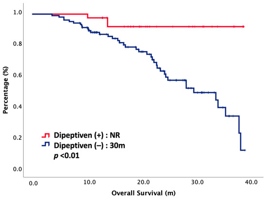 At the cut-off date of our study, only 29% patients had died. The oncologic outcomes between dipeptiven (+) and dipeptiven (–) are presented in Table 2. The toxicity of CCRT was improved under dipeptiven support. The CCRT interruption rate was significantly lower in the dipeptiven (+) group than in the dipeptiven (–) group, accounting for 0% and 21%, respectively (p < 0.01). The SAE rate was also significantly lower in the dipeptiven (+) group than in the dipeptiven (–) group, accounting for 0% and 12%, respectively (p = 0.02). However, ORR and DCR did not have significance in either arm. The ORR and DCR values were 100% vs. 90% and 100% vs. 96% in the dipeptiven (+) vs. dipeptiven (–) group, respectively. Notably, the CR rate was significant in dipeptiven (+) as compared with dipeptiven (–), accounting for 78% vs. 57%, respectively (p = 0.02). The median OS was not reached in the dipeptiven (+) group, and it was 30 months in the dipeptiven (–) group (p < 0.01). The survival curve is plotted in Figure 1.