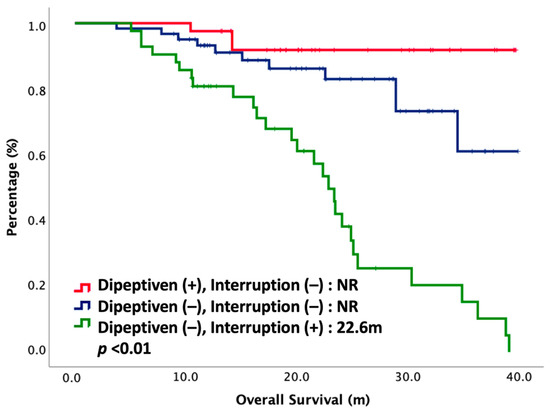 Cox regression analyses with survival for potential prognostic factors were performed. Hazard ratios (HR) with 95% CI (confidence interval) are depicted in Table 3. Univariate analysis showed BMI (HR: 0.48, 95% CI: 0.26–0.89, p = 0.02), induction chemotherapy (HR: 0.10, 95% CI: 0.01–0.74, p = 0.02), adjuvant chemotherapy (HR: 0.21, 95% CI: 0.11–0.40, p < 0.01), dipeptiven supplement (HR: 0.13, 95% CI: 0.04–0.44, p < 0.01), and CCRT interruption (HR: 0.15, 95% CI: 0.08–0.29, p < 0.01) were strongly correlated with OS. Multivariate analysis demonstrated that dipeptiven supplementation (HR: 0.31, 95% CI: 0.09–0.95, p = 0.04) and CCRT interruption (HR: 0.32, 95% CI: 0.15–0.68, p < 0.01) were independent predictors associated with better survival. Patients were then stratified according to these two predictive markers: dipeptiven supplement and CCRT interruption. OS was significantly different between each group. The OS curve of each group is plotted in Figure 2. The OS was longest in patients with dipeptiven supplementation, followed by patients without dipeptiven supplementation. Patients who had CCRT interruption had significantly worse OS.