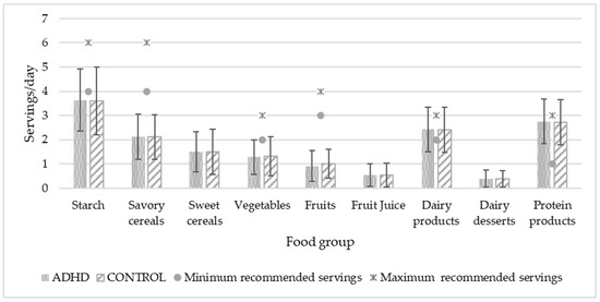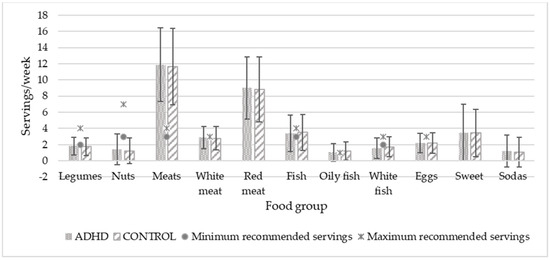 To compare food consumption with SENC recommendations, the two age groups were combined because the servings were the same for both. Figure 1 and Figure 2 show the food consumption in servings per day and per week, respectively. Significant differences were found in fruit consumption (p = 0.033), which was higher in the control group. In both graphs, minimal and maximal servings recommended by the public administration are expressed by dots and asterisks, respectively, except for those foods that should not be eaten or should be eaten occasionally, for which there is no recommendation. Only the consumption of protein foods in general, dairy products (milk, yogurt, and cheese), and fish agreed with the experts’ recommendations.