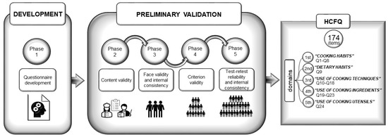 The development and preliminary validation of the new Home Cooking Frequency Questionnaire (HCFQ) was carried out over five phases: questionnaire development, content validity, face validity and internal consistency, criterion validity, and test stability and internal consistency (Figure 1) [27].