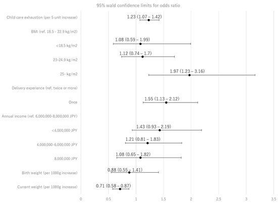 Table 3 shows the factors associated with exclusive breastfeeding failure at two months. Logistic regression models demonstrated that two domains of the CSS, including childcare exhaustion and worry about child development, were associated with an increased risk of partial breastfeeding (both p < 0.001). Significant variables in univariate logistic models selected at p < 0.2 included child care exhaustion, worry about child development, maternal BMI, the number of delivery experience, annual income, birth weight, and current infant weight. In Model 1 (Figure 2), where childcare exhaustion was included, the risk of partial breastfeeding increased with childcare exhaustion (OR 1.23 per 5-point increase; 95% CI 1.07–1.42), obesity (OR 1.97, 95% CI: 1.23–3.16) compared to normal weight, and one-time delivery experience (OR 1.55, 95% CI: 1.13–2.12), while the risk decreased with a 1000-g increase of current infant weight (OR 0.71, 95% CI: 0.58–0.87). In Model 2, where worry about child development was included, the risk of partial breastfeeding increased with obesity compared to normal weight (OR 1.96, 95% CI: 1.23–3.12), one-time delivery experience (OR 1.45, 95%CI: 1.05–2.00), and a 1000-g increase of current infant weight (OR 0.69, 95% CI: 0.56–0.85).