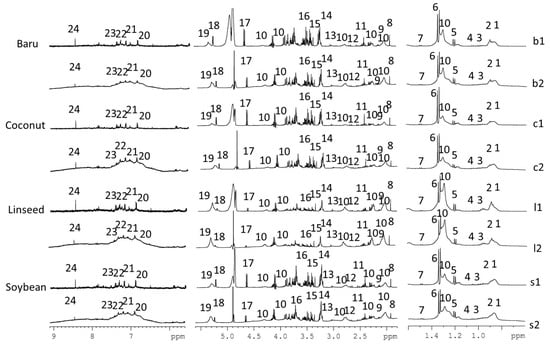 In the sPLS-DA loading 3 plot (Figure 2e), the variables at 2.77 and 2.75 ppm, which correspond to the bis-allylic hydrogen signals present in polyunsaturated fatty acid (PUFA), revealed the separation of the baru group from the others, especially from the coconut group. This result is in accordance with coconut oil’s composition, which is a source of saturated fatty acids (Table S1).