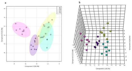 PCA, an unsupervised pattern recognition method, was not sufficient to distinguish the four sample groups, especially due to the baru group’s dispersion (Figure S6a). On the other hand, when the baru group was removed, the PCA for the remaining samples revealed differences between the linseed group and coconut and soybean groups (Figure S6c). Both PCAs presented α/β-glucose, LDL/VLDL, lactate, and fatty acid metabolites as loadings (Figure S6b,d). In order to maximize the differences between the studied groups, we used sPLS-DA as a supervised pattern recognition method (Figure 2a,b). The sPLS-DA algorithm was used to select variables considered important to explain the separation between the different declared groups and the similarities between similar groups [31].