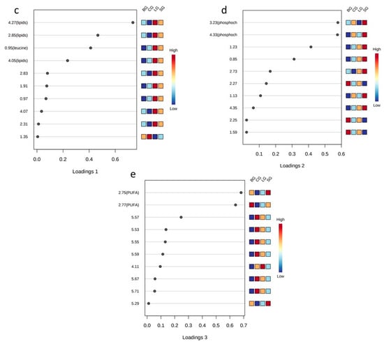 The 2D (a) and 2D (b) sPLS-DA score plots and loadings for components 2 (c–e) obtained from the 1H NMR spectra (NOESYGPPR1D) of the serum samples from Swiss mice fed diets based on baru, coconut, linseed, and soybean oils. Legend: baru (BG), coconut (CG), linseed (LG), and soybean oil (SG) groups.
