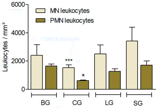 In this study, CG showed less leukocyte recruitment, suggesting a greater anti-inflammatory response (p < 0.001) in PMN cells and MN cells (p < 0.05) (Figure 4).