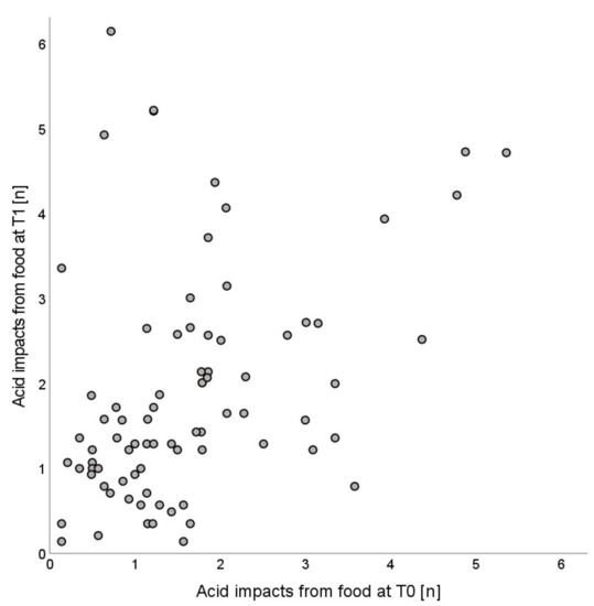 Scatterplot of acid impacts from food per day at baseline (T0) and at the end of the observation period after one year (T1).