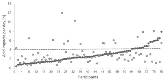 Scatterplot of acid impacts per day at T0 and T1, participants were ranked by their acid impacts at T0. The dotted line indicates the threshold for low and high acid impact groups; black dots indicate the number of acid impacts per day at T0 and the grey dots the corresponding values at T1.