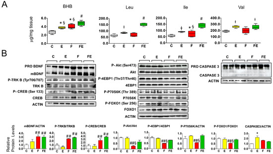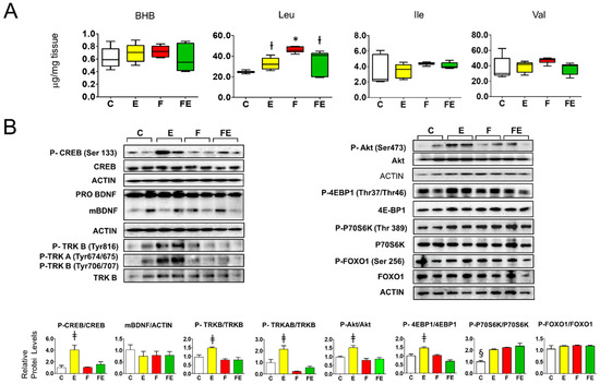 Association of tissue beta hydroxy butyrate and branched-chain amino acids with BDNF-Akt-mTOR-FOXO1 signaling in the prefrontal cortex of fasted rats undergoing mild endurance exercise. (A): Mass Spectrometry analysis of prefrontal cortex levels of BHB, Leu, Ile, and Val; (B): Western immunoblot analysis of prefrontal cortex proteins involved in BDNF-mTOR signaling, with quantified data shown below. (A,B): Analysis was carried out comparing control rats with rats subjected to exercise, fasting, or fasting with exercise. (N = 4, n = 3). One way ANOVA was carried out followed by a Newman Keuls post-hoc test. * p < 0.05 vs. C, † p < 0.05 vs. C and F, ‡ p < 0.05 vs. C, F and FE. § p < 0.05 vs. E, F and FE. Abbreviations: N: biological replications, n: technical replications. Data are shown as means ± SEM.