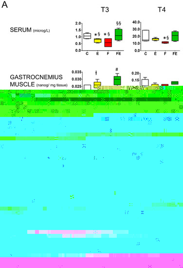 In this context, one key factor, namely thyroid hormone, impacts central and peripheral physiological events ranging from muscle mass and function to behavior [16]. Indeed, hypothyroidism is associated with muscle weakness (see, for review, [17]). Physical exercise is one condition that may influence T3 serum and tissue availability. Notably, the metabolic effects of exogenous administration of thyroid hormones share several similarities with those elicited by exercise [18]. The upregulation of free (f) T3 and fT4 serum levels by low-intensity endurance exercise has been observed in humans [19,20] and is associated with amelioration of academic performance in one study [20], and exercise intensity positively correlates with fT3 serum levels [19]. However, T3 serum levels are not consistently shown to be associated with physical activity, neither in humans [21] nor in rodents [22,23].