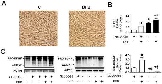 Effect of BHB on BDNF expression and maturation in L6 cells cultured in the presence and absence of 25 mM glucose (N = 6). (A): Morphology of cells cultured in absence or presence of 8 mM BHB for 3 days. The images represent cells cultured in absence of glucose, similar results were observed in presence of glucose (not shown). Scale bar: 100 μM. (B): BDNF mRNA levels in cells cultured in the presence and absence of 25 mM glucose and treated with solvent or 8 mM BHB. * p < 0.05 vs. control cells in presence of glucose, # p < 0.05 vs. control cells in absence of glucose; (C): Protein levels of proBDNF and mBDNF in cells cultured in presence and absence of 25 mM glucose and treated with solvent or 8 mM BHB. * p < 0.05 vs. control cells in presence of glucose, § p < 0.05 vs. cells in presence of glucose treated with solvent or 8 mM BHB. one way ANOVA was carried out followed by a Newman Keuls post-hoc test. Data are shown as means ± SEM.