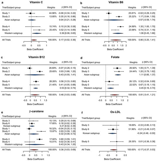Table 3 summarizes the results of Cochran’s Q test conducted to test the heterogeneity of the results among the different studies for choosing the most appropriate statistical model for the meta-analysis. The data were shown only for the six variables with statistically significant outcomes for the meta-analysis, and the results for variables without statistical significance are presented as supplementary information (Supplementary Table S1). In addition, we note that the data for vitamin B12 and β-carotene were normalized by inverse-normal transformation, while those for vitamin C, vitamin B6, folate, and ox-LDL were normalized by square-root transformation, based on the rule for the normalization process explained in the Materials and Methods section.