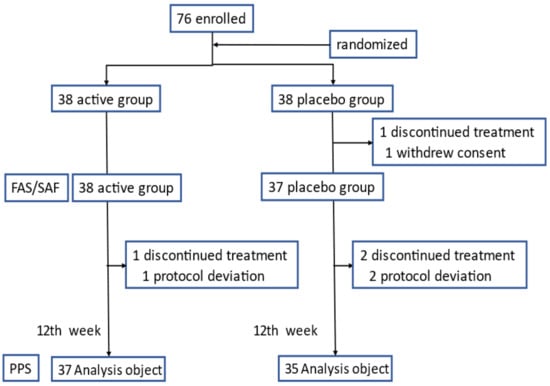 Subjects were randomized according to their age and CLSS to placebo and SPE treatment (active) groups using the permuted block technique. One subject withdrew from the study prior to the start date; therefore, the study was initiated with 75 subjects (Figure 1). A randomization table was kept sealed until the end of the study and was opened after the study period.