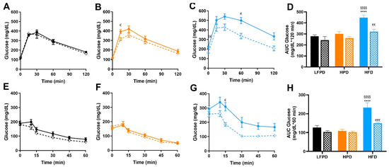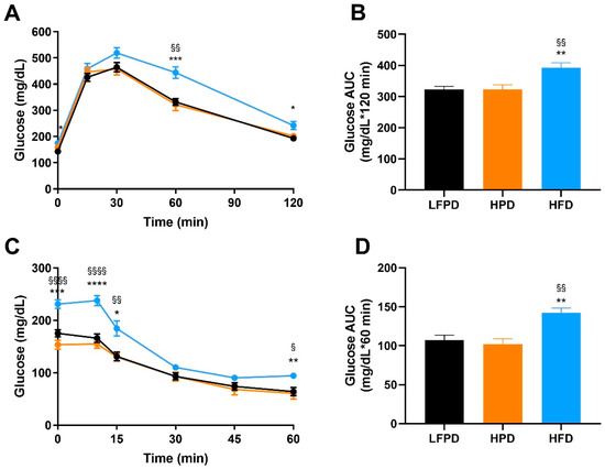 Six weeks of HFD impaired whole-body glucose tolerance and insulin sensitivity. (A) Glucose tolerance test exclusion curve, (B) Glucose tolerance area under the curve (AUC), (C) Insulin tolerance test exclusion curve, and (D) Insulin tolerance AUC. N = 14–30 per group. One or two-way ANOVA were used with Tukey’s multiple comparison test (* p < 0.05, ** p < 0.01, *** p < 0.001, **** p < 0.0001 LFPD vs. HFD, § p < 0.05, §§ p < 0.01, §§§§ p < 0.0001 HPD vs. HFD). Data are expressed as the mean ± SEM.