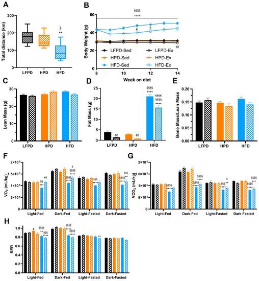 Eight weeks of exercise significantly improves body composition and reverses the detrimental effects of an HFD in oxygen consumption. (A) Total distance run, (B) Body weight, (C) Total lean mass, (D) Total fat mass, (E) Bone mass normalized to lean mass, (F) Oxygen consumption (VO2), (G) Carbon dioxide production (VCO2), and (H) Respiratory Exchange Ratio. N = 7–15 per group). T-test or one or two-way ANOVA were used with Tukey’s multiple comparison test (** p < 0.01, *** p < 0.001, **** p < 0.0001 LFPD vs. HFD, § p < 0.05, §§ p < 0.01, §§§ p < 0.001 §§§§ p < 0.0001 HPD vs. HFD, # p < 0.05 LFPD vs. HPD, € p < 0.05, €€ p < 0.01, €€€€ p < 0.0001 Sedentary vs. Exercise). Data are expressed as the mean ± SEM. Box and whisker plot is shown as min to max with median.