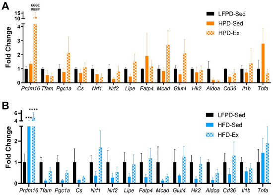 Exercise affects expression of metabolic and inflammatory genes in scWAT. (A,B) Gene expression data of scWAT (n = 3–7 per group). One-way ANOVA was used with Tukey’s multiple comparison test. (*** p < 0.001, **** p < 0.0001 LFPD vs. HFD, HPD vs. HFD, #### p < 0.0001 LFPD vs. HPD, €€€€ p < 0.0001 Sedentary vs. Exercise). Data are expressed as the mean ± SEM.